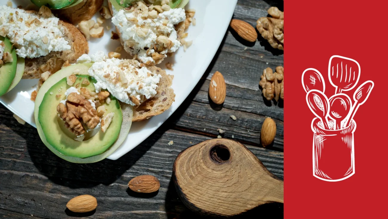 Bruschette cu Brânză de vaci de la Brânzeturi Lunca Ilvei, avocado, felii de măr și nuci