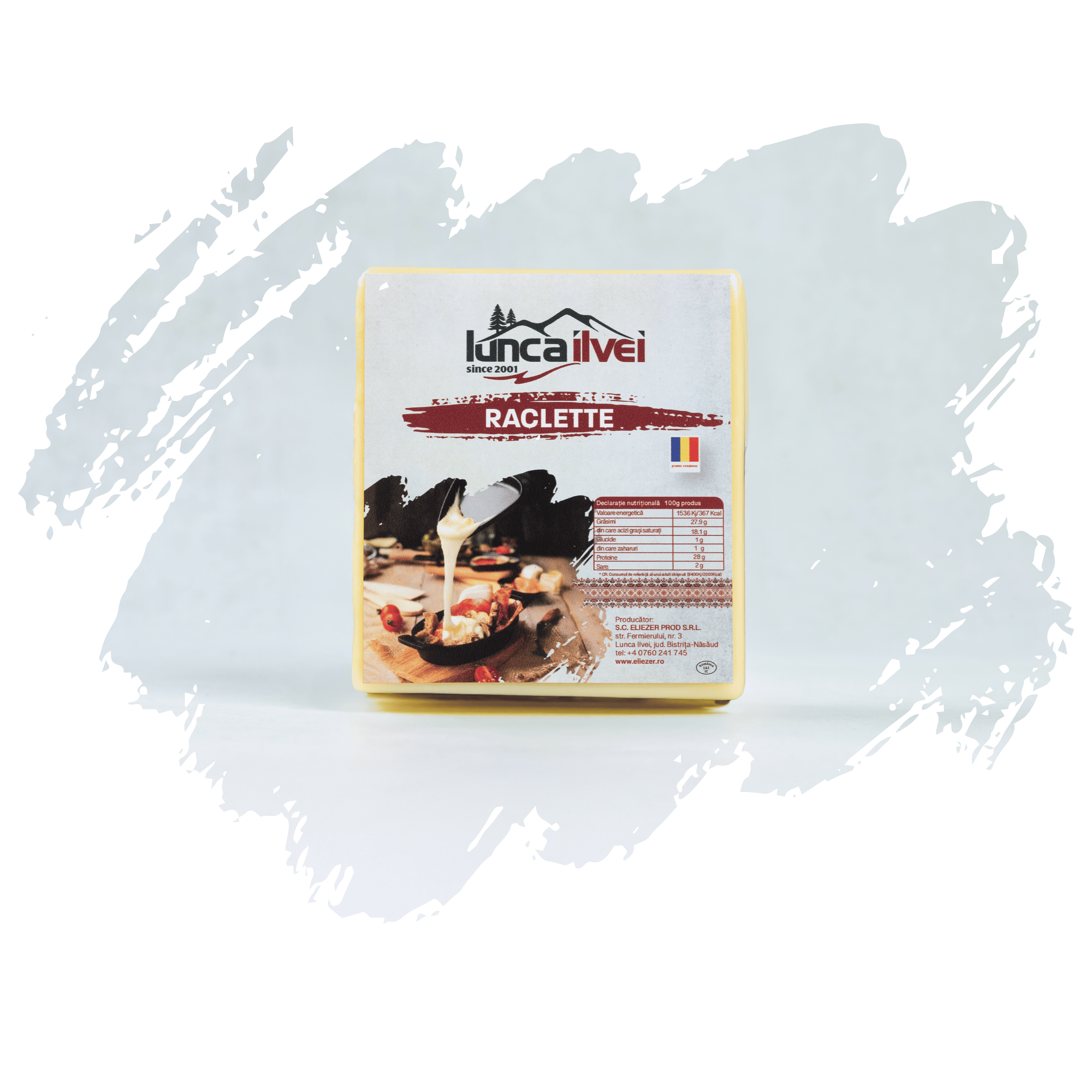 Brânza Raclette face parte din familia brânzeturilor maturate, cu perioada lungă de maturare. Produsul este obținut din lapte de vacă pasteurizat. Este o brânză de origine elvețiană, maturată, cu pastă semitare, culoare galben intens, consistență untoasă, gust plăcut, aromă de brânzeturi fermentate natural, minim 45% grăsime raportată la S.U.